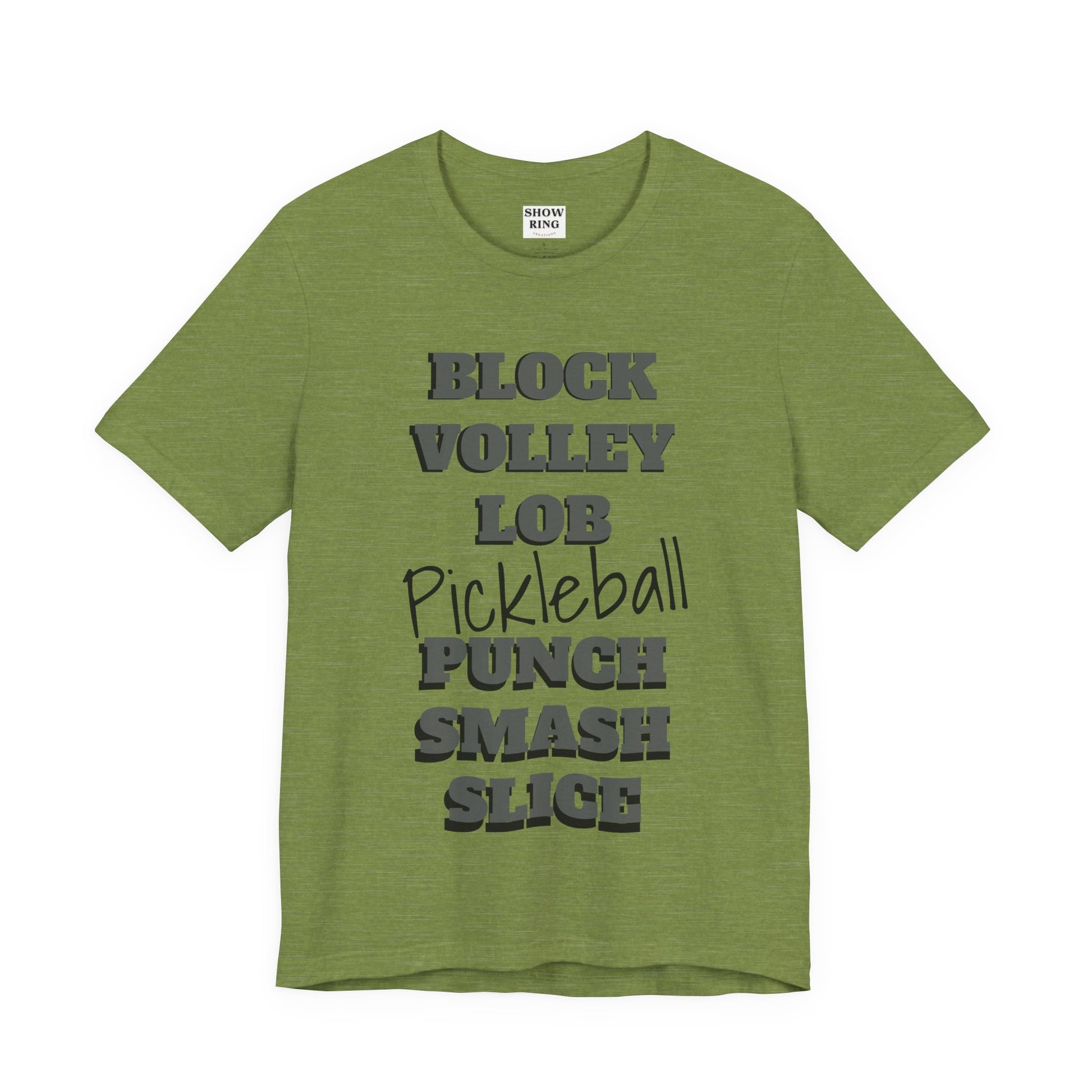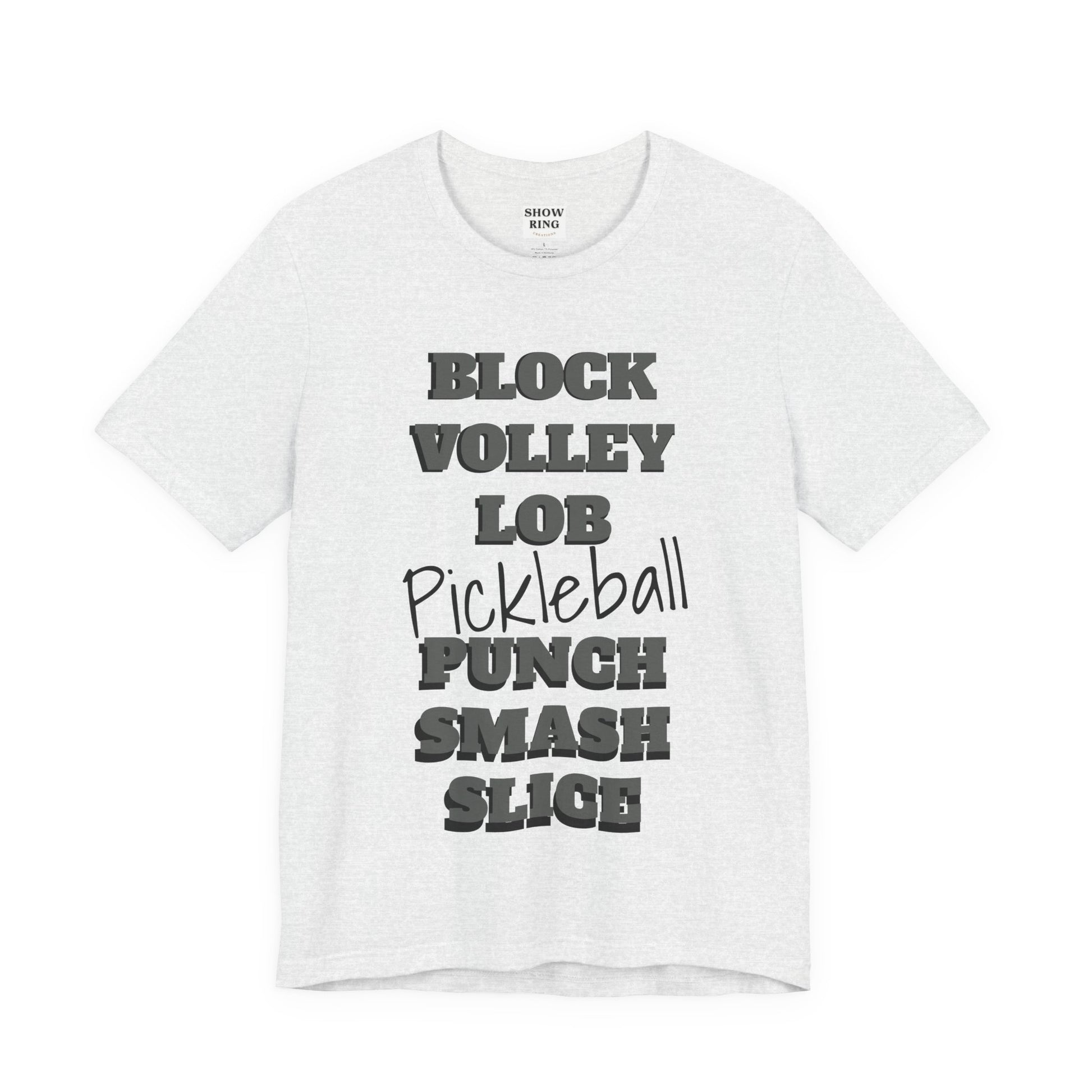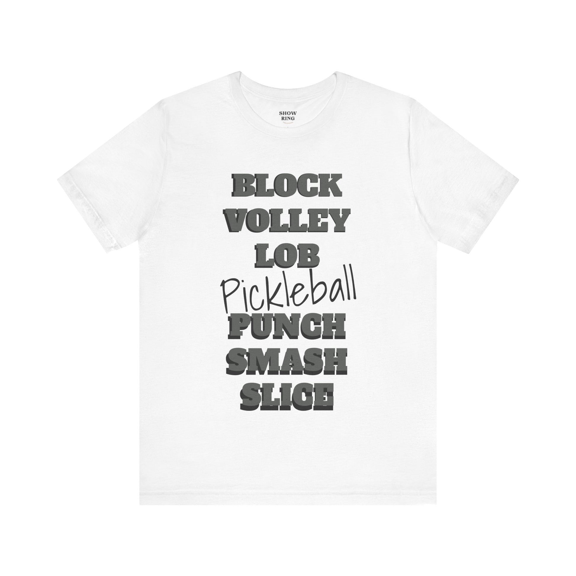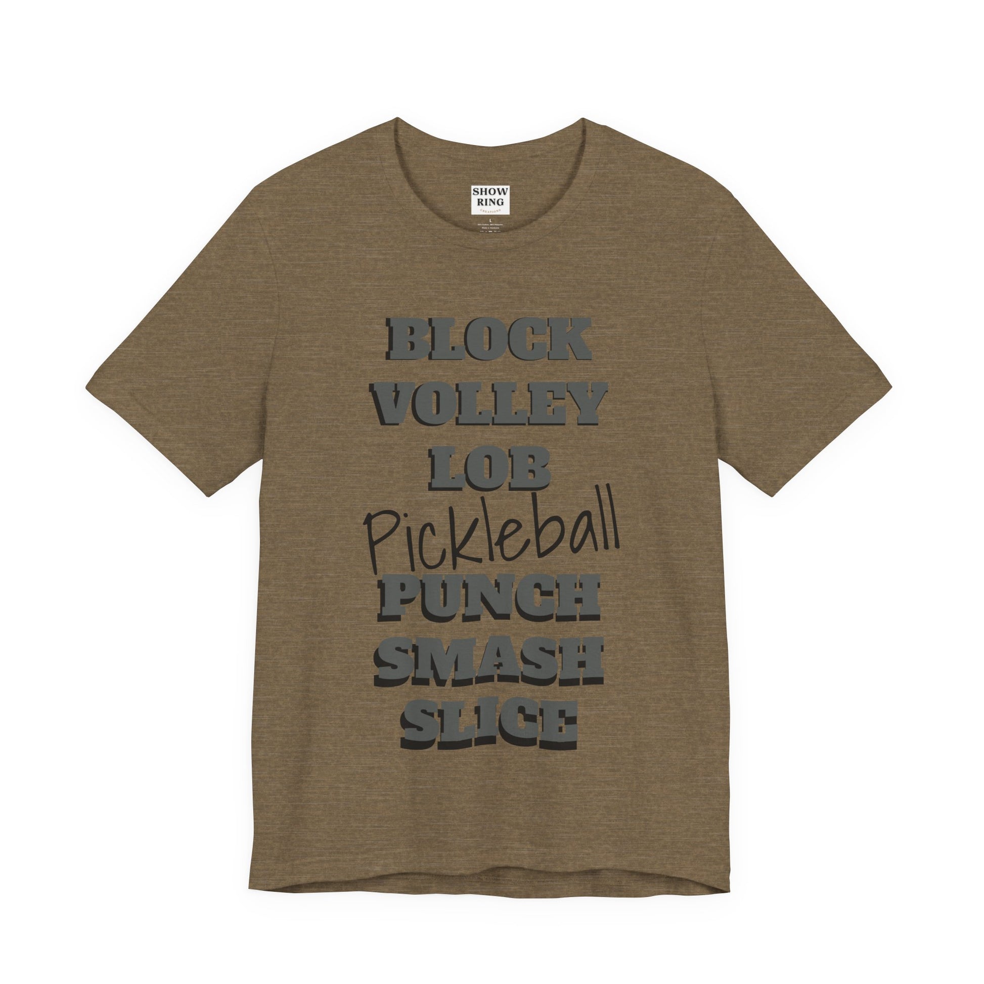 Pickleball Vibes Tee, For Players Who Live the Game, Featuring Bold Words Block, Volley, Lob, Punch, Smash, Spike